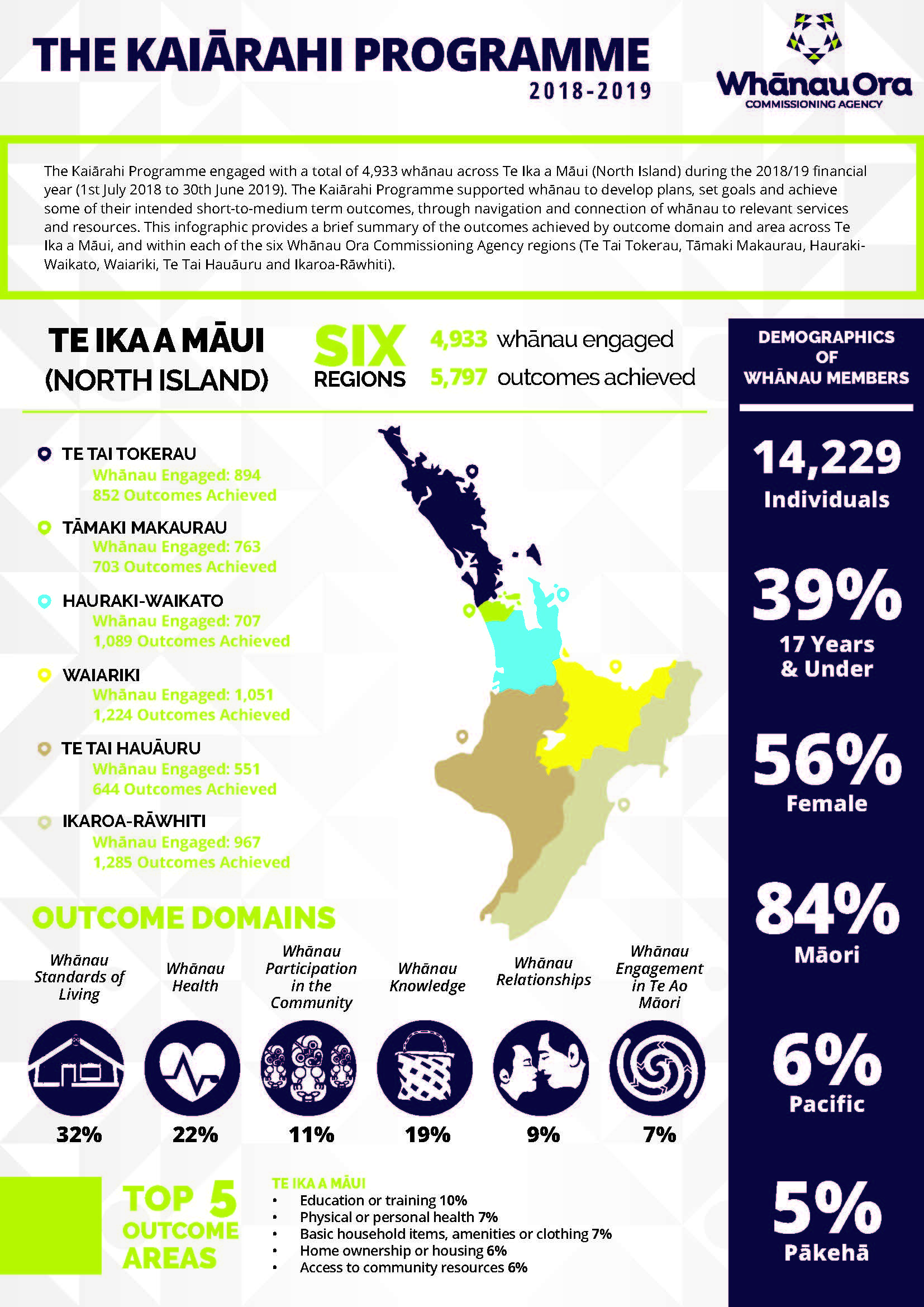 The Kaiārahi Programme engaged with a total of 4,933 whānau across Te Ika a Māui (North Island) during the 2018/19 financial year (1st July 2018 to 30th June 2019). The Kaiārahi Programme supported whānau to develop plans, set goals and achieve some of their intended short-to-medium term outcomes, through navigation and connection of whānau to relevant services and resources. This infographic provides a brief summary of the outcomes achieved by outcome domain and area across Te Ika a Māui, and within each of the six Whānau Ora Commissioning Agency regions (Te Tai Tokerau, Tāmaki Makaurau, Hauraki-Waikato, Waiariki, Te Tai Hauāuru and Ikaroa-Rāwhiti).