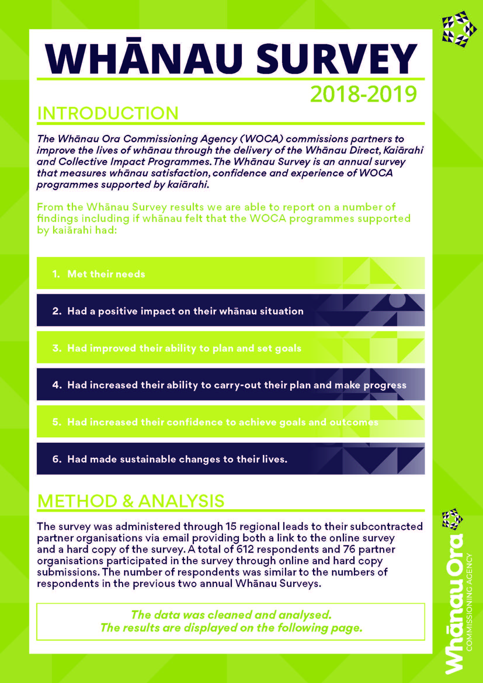The Whānau Ora Commissioning Agency (WOCA) commissions partners to improve the lives of whānau through the delivery of the Whānau Direct, Kaiārahi and Collective Impact Programmes. The Whānau Survey is an annual survey that measures whānau satisfaction, confidence and experience of WOCA programmes supported by kaiārahi.
